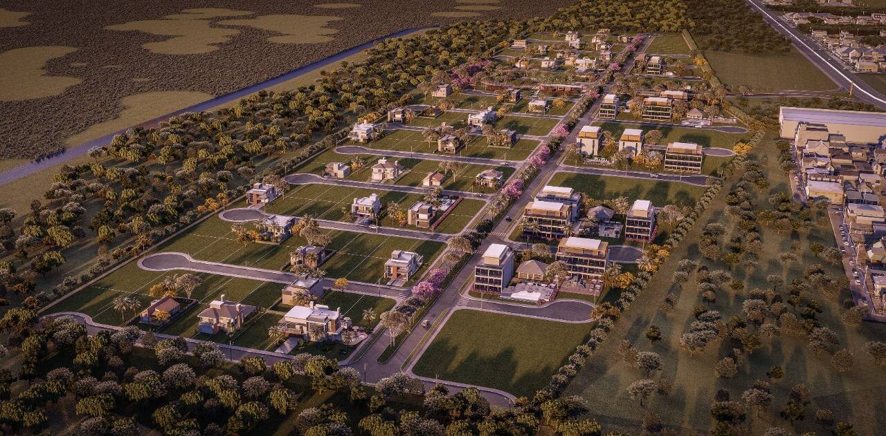 Condomínio aberto, conceito de Novo Urbanismo, com ruas largas, arborização e áreas públicas de lazer